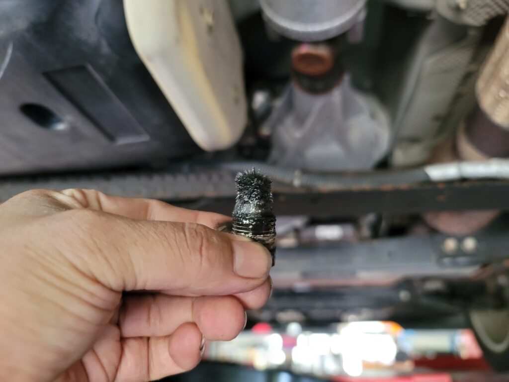 자석 드레인 플러그의 금속분을 세척해 마모 상태를 점검하고, 규정량 신유리필 후 누유 점검을 마칩니다.+